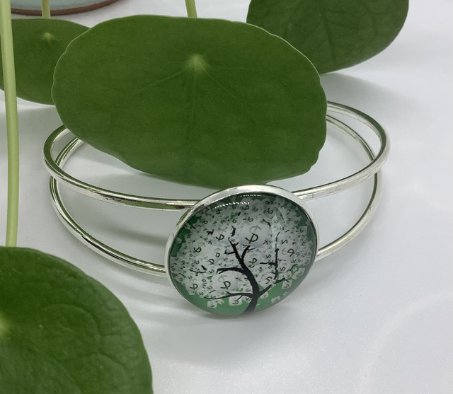 Portez un symbole de vie, d'amour et de croissance avec ce bracelet unique et poétique. Son design épuré, avec son jonc double-rang en métal argenté, met en valeur un cabochon central qui attire tous les regards.