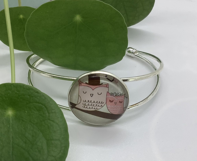 Au centre, un cabochon de verre rond met en scène une illustration pleine de charme : deux petits hiboux colorés se blottissent l'un contre l'autre, entourés de cœurs. L'un est bleu et vert, l'autre est rose et violet, formant un duo attachant et joyeux.