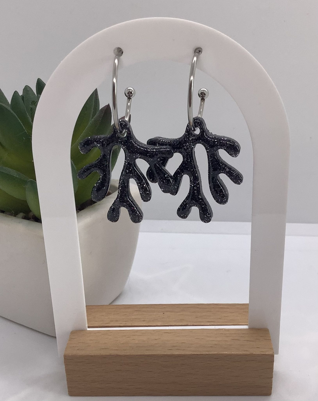 Leur forme de corail stylisé, d'un noir profond et scintillant, évoque les trésors cachés au fond des abysses.
