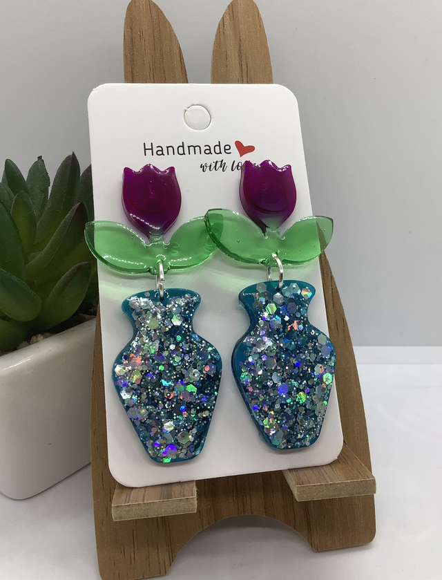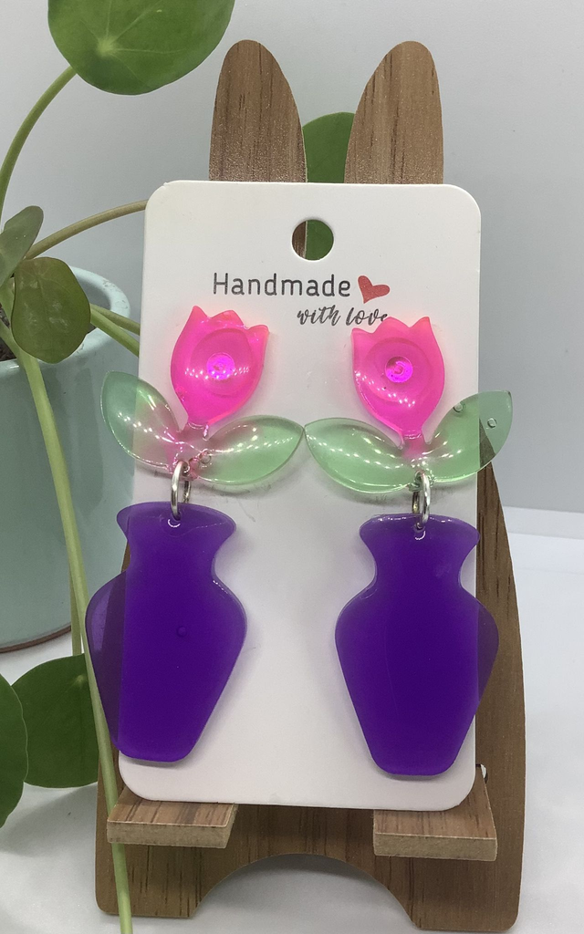 Les fleurs sont gracieusement suspendues au-dessus de vases d'un violet profond, créant un contraste saisissant et harmonieux. Ces boucles d'oreilles ne sont pas de simples accessoires, mais de petits tableaux qui racontent une histoire, celle d'une élégance poétique et d'un amour pour les choses simples et belles.