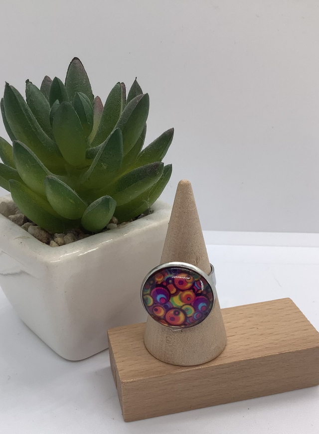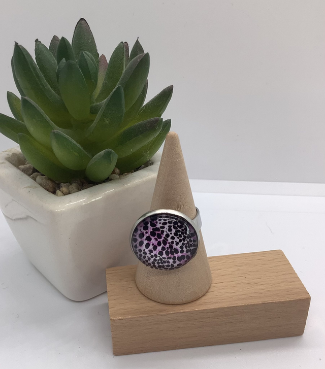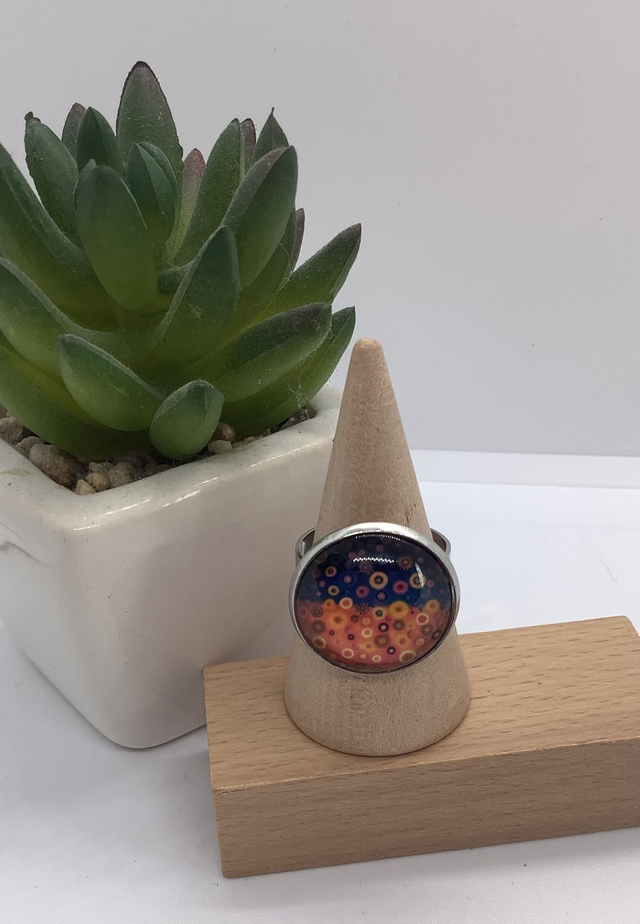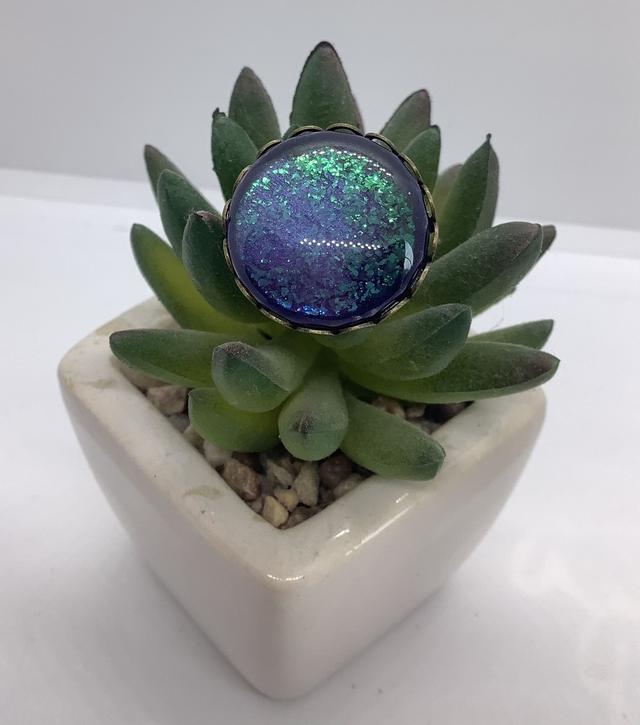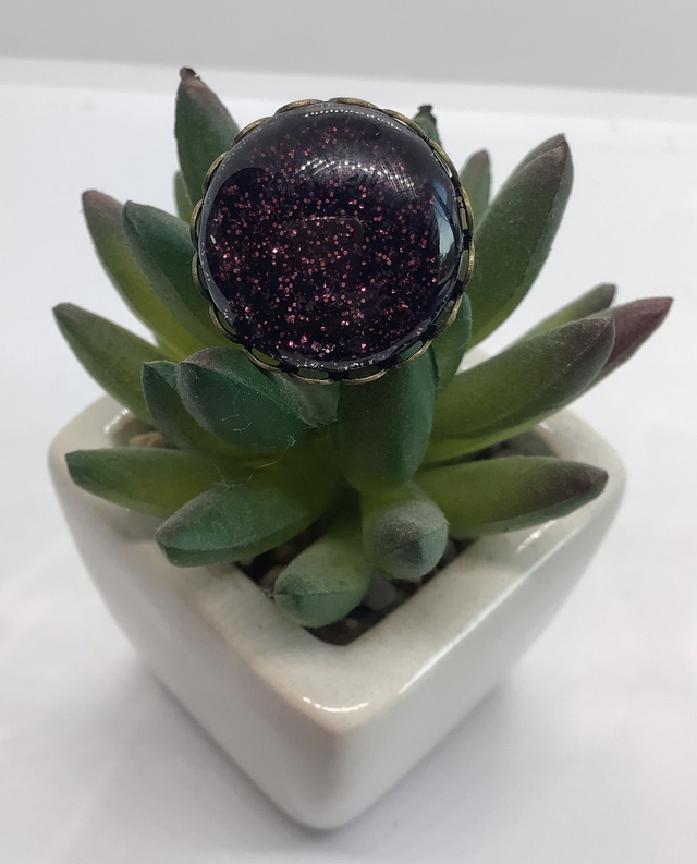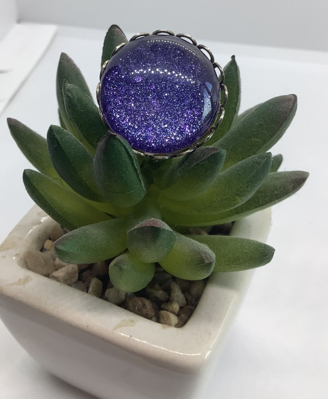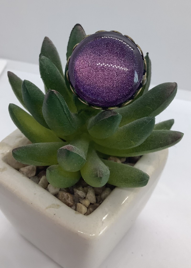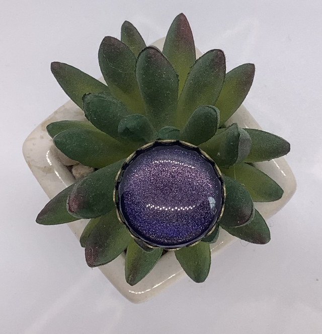 Portez un fragment de l'univers au bout de vos doigts avec cette bague audacieuse et mystérieuse. Son large cabochon de forme ronde, magnifiquement serti dans un support en métal, renferme une image hypnotique de nébuleuse. Les couleurs profondes de pourpre, violet et rose se mêlent à des nuages d'étoiles scintillantes, évoquant la beauté lointaine du cosmos. Les autres cabochons sauront également vous séduire.