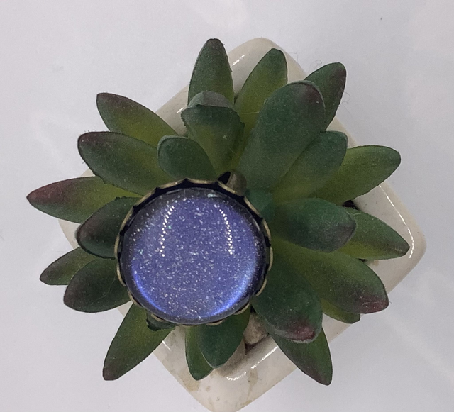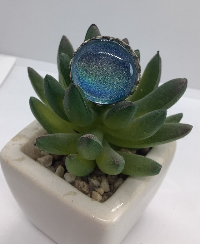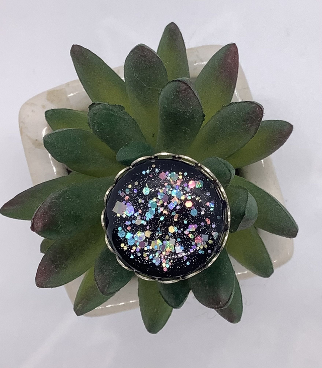 - Matériaux : Cabochon en résine, image de galaxie, support en métal argenté.